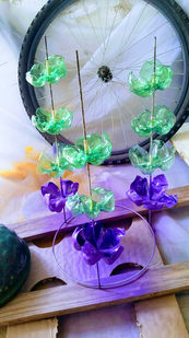 Bottle blossoms are flowers made from discarded plastic bottles. Many are collected during local litter clean ups. Each bottle is washed and sanitized. Bottles are then carefully cut into the desired shape and, if needed, heat sculpted. After shaping, each flower is painted and dried. Next, flowers are given a stem, again made from various single use items; some are made from old pen casings, coat hangers or specially heat sculpted soda bottle rope. Other parts of bottles make the leaves.